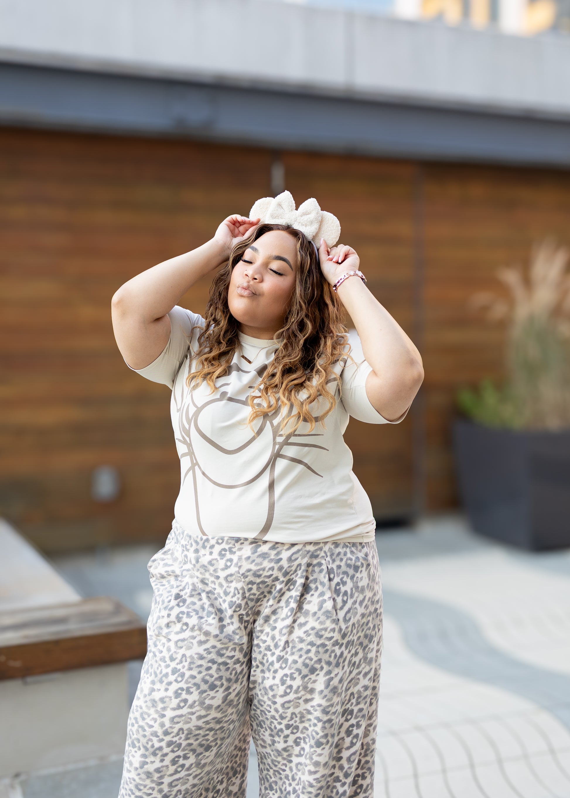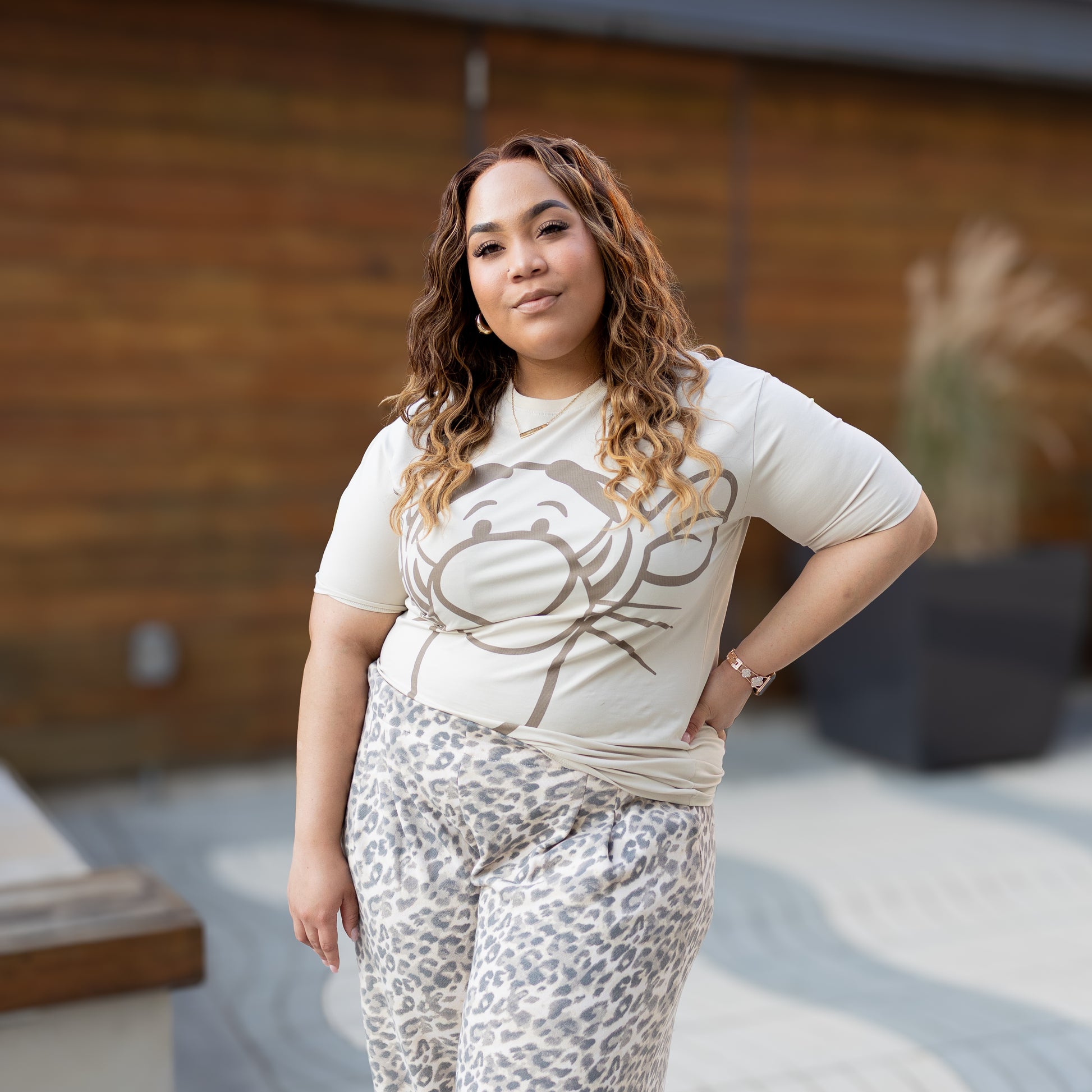 Cool and comfortable tee with a true to size fit. Model is in an XL. Sizing up is recommended for men or for an oversized fit.